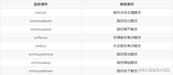 //2.事件类型 如何触发 什么事件 比如鼠标点击(onclick) 还是鼠标经过 还是键盘按下