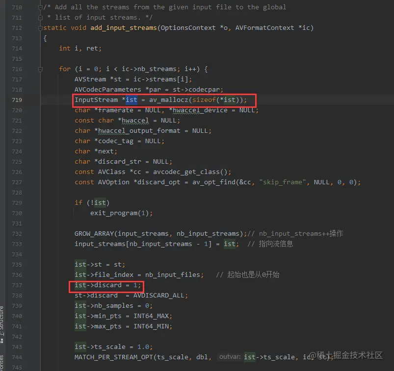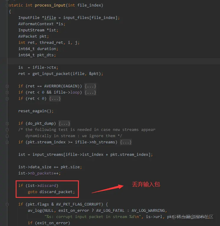 在 add_input_stream() 里面 创建输入流的时候, ist->discard 默认是 1 (默认读出来的AVPacket全部丢弃),只有执行了 new_video_stream() -> new_output_stream() 的时候才会把 ist->discard 设置成 0。