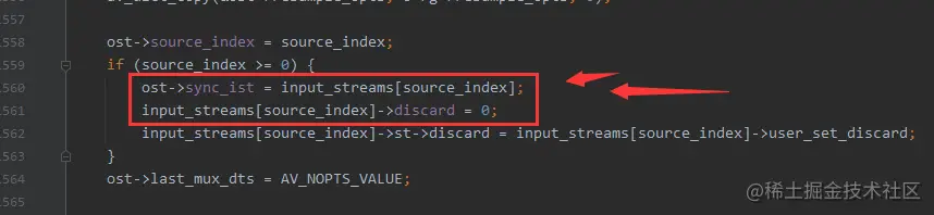 可以看到 在 ffmpeg_opt.c 1559行,根据输出流来决定输入流的 discard 的值要不要开启。