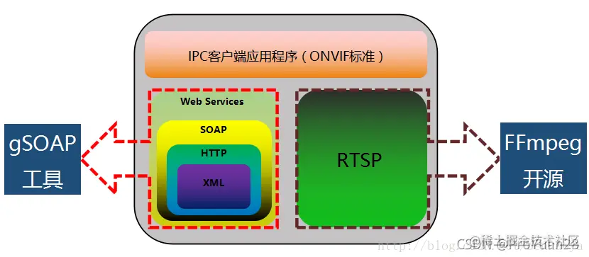 简单粗暴的理解:IPC的各种参数获取/配置都是通过ONVIF协议实现,而音视频流多媒体传输采用的是RTP/RTSP协议实现。