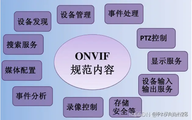 ONVIF接口被划分为不同模块,包括:设备发现、设备管理、设备输入输出服务、图像配置、媒体配置、实时流媒体、接收端配置、显示服务、事件处理、PTZ控制等。