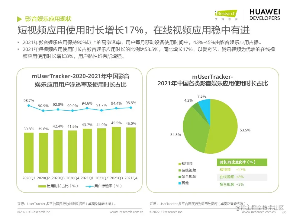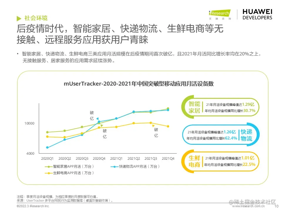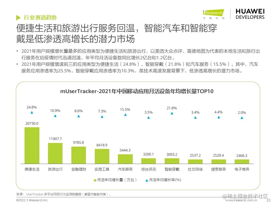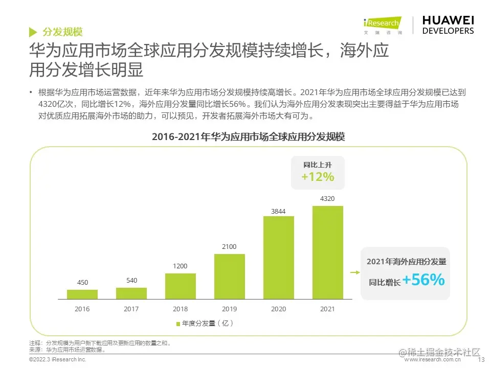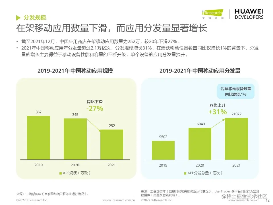 华为开发者联盟与艾瑞咨询联合发布《2022年移动应用趋势洞察白皮书》,本白皮书主要分析移动应用行业发展现状和趋势,并对影音娱乐、通讯社交、电商生活、运动健康、出行导航等细分行业场景进行分析,把握移动应用细分行业发展特色和趋势,为广大开发者的开发和运营决策提供参考。