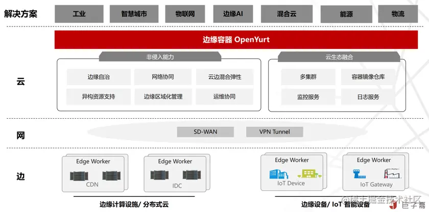OpenYurt 以上游开源项目 Kubernetes 为基础,针对边缘场景适配的发行版。是业界首个依托云原生技术体系、“零”侵入实现的智能边缘计算平台。具备全方位的“云、边、端一体化”能力,能够快速实现海量边缘计算业务和异构算力的高效交付、运维及管理。