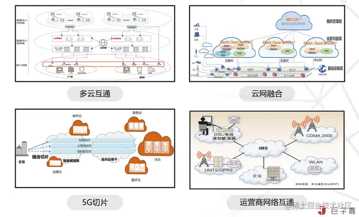 这里说一下运营商网络,中心云计算技术,是将数据中心内部网络全部虚拟化,即云内网络,衍生出 VPC,负载均衡等诸多产品;数据中心外部几乎完全屏蔽运营商网络,只提供弹性公网 IP 及互联网出口带宽服务,中心云计算与运营商网络没有融合;但从中心云计算演进到边缘计算,是强依赖网络将中心云与边缘链接起来,如果中心云是大脑,边缘计算是智能触角,那么网络就是神经,就是动脉血管,但实际上整体网络规划与建设发生在云计算发展之前,并不是专门服务云计算的,所以中心云计算与运营商网需要融合,即云网融合,云网融合最终目标是实现云能力的网络化调度编排,网络能力的云化快速定义。希望借助新型业务需求和云技术创新,驱动运营商网络架构深刻变革升级开放。