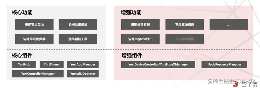 - 保证 Kubernetes 能力完整一致,同时兼容现有的云原生生态体系的同时,尽最大肯能将云原生体系下沉至边缘;