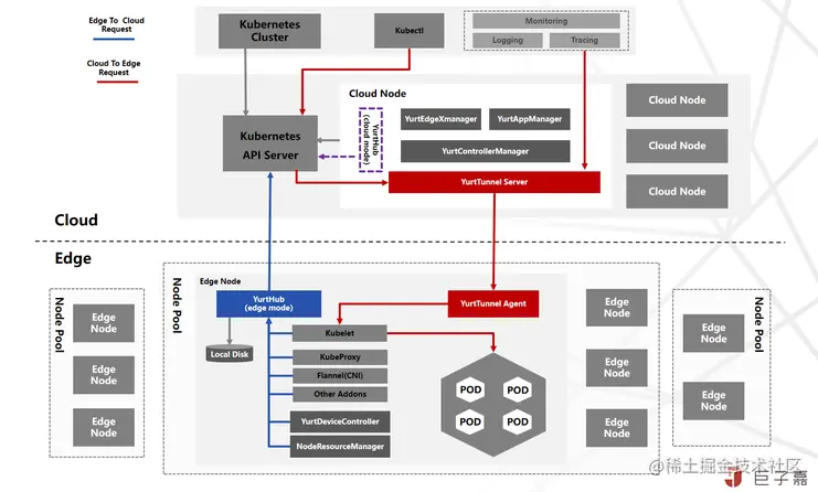 - 针对 Kubernetes 能力完整及生态兼容,通过新增 YurtTunnel 组件,构建云边(Cloud To Edge Request)反向通道,保证 Kubectl,Promethus 等中心运维管控产品一致能力及用户体验;同时将中心其他能力下沉至边缘,包含各不同的工作负载及 Ingress 路由等;