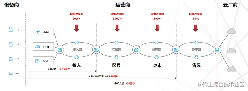 边缘计算位于中心云及终端之间,将云计算能力由中心下沉到边缘,通过云边协同的架构解决特定的业务需求,能最大程度降低传输时延,这也是边缘计算的核心价值。但中心云与终端之间的网络传输路径经由接入网(距离 30 公里,延迟 5 到10 毫秒),汇聚网,城际网(距离 50 到 100 公里,延迟 15 到 30 毫秒)到骨干网(距离 200 公里,延迟 50 毫秒),最后才到数据中心(假定数据中心 IDC 都在骨干网),耗时数据是正常网络拥塞的拨测统计值,即业务侧感知的实际延迟数据,虽不是非常精确,但足够辅助架构决策。