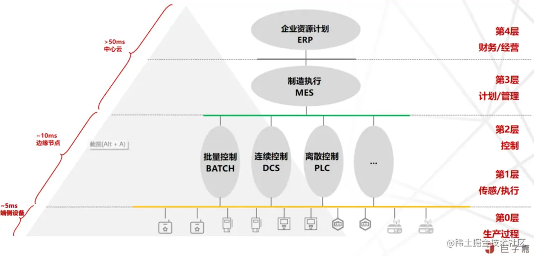 从业务应用来看,财务/经营,计划/管理两层属于管控运营类的应用,就是需要通过中心云统一汇聚,实现集中化强管控;对延迟不敏感,对安全,大数据分析能力等要求较高;控制,传感/执行,生产过程三层属于运作支撑类应用,也可以优先考虑中心云;如果业务场景对延迟敏感,才考虑通过边缘计算能力,实现分散式低时延响应;