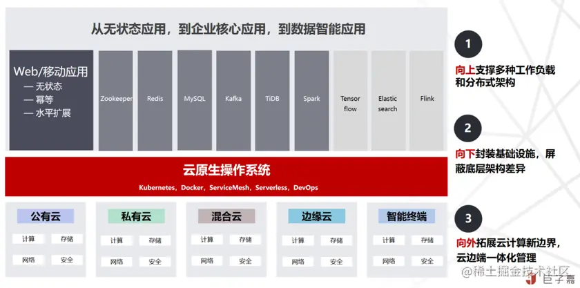- “云边一体化”原则:保证与中心云一致的用户体验及产品能力的基础上,通过云边管控通道将云原生能力下沉至边缘,实现海量的智能边缘节点及业务应用,基础架构提升至业界领的云原生架构的重大突破。