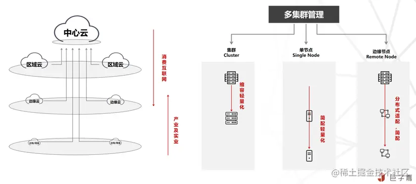 - 将中心大规模资源池化,多应用委托调度共享资源的模式,适配为面向地域小规模甚至单节点资源,实现边缘场景下,更精细化的单元化工作负载编排管理;