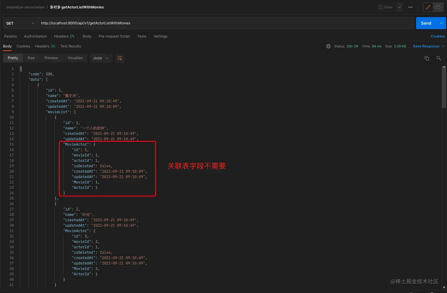 3、多对多时,一般不需要展示关联表的字段,可通过 include through attributes 将关联表字段过滤,如下: