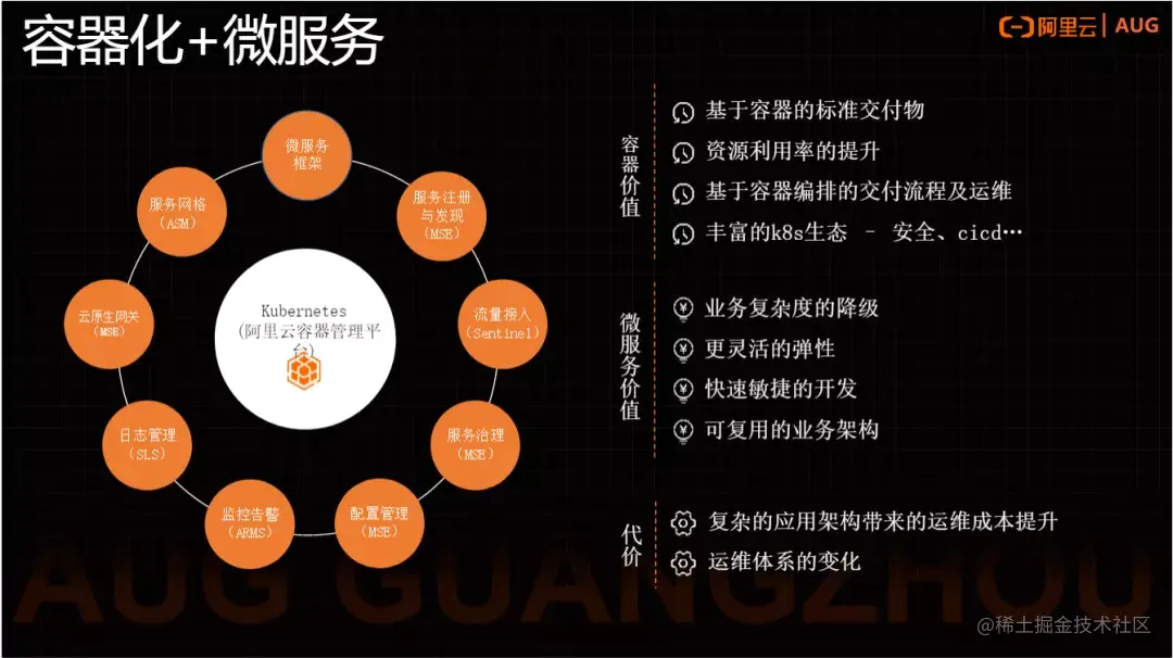 微服务不是免费的午餐,你用了它,得到业务收益之外,也要为它做很多额外的事情,比如服务、注册、发现和配置中心高可用、服务治理能力,如何保障线下流量的可控,还有网关层的设计、日志监控等,这一系列的东西都是当企业决定把它的微服务跑在容器上时需要去考虑的问题,其实今天在阿里云是有一个完整体系的。大家可以思考一下,今天你在容器上跑微服务的时候哪些是已经考虑并且做到的,哪些是需要加强的。