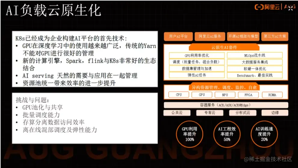 但同时 AI 云原生化也有非常多的挑战,比如说 GPU 如何做池化和共享、调度能力、数据访问效率这些都是把 AI 放到 K8s 之后面临的一些挑战,相应的也会有很多解决方案,有些可能是开源,有些是阿里云提供的,帮助用户完成 AI 在原生化过程中碰到各种各样的问题。
