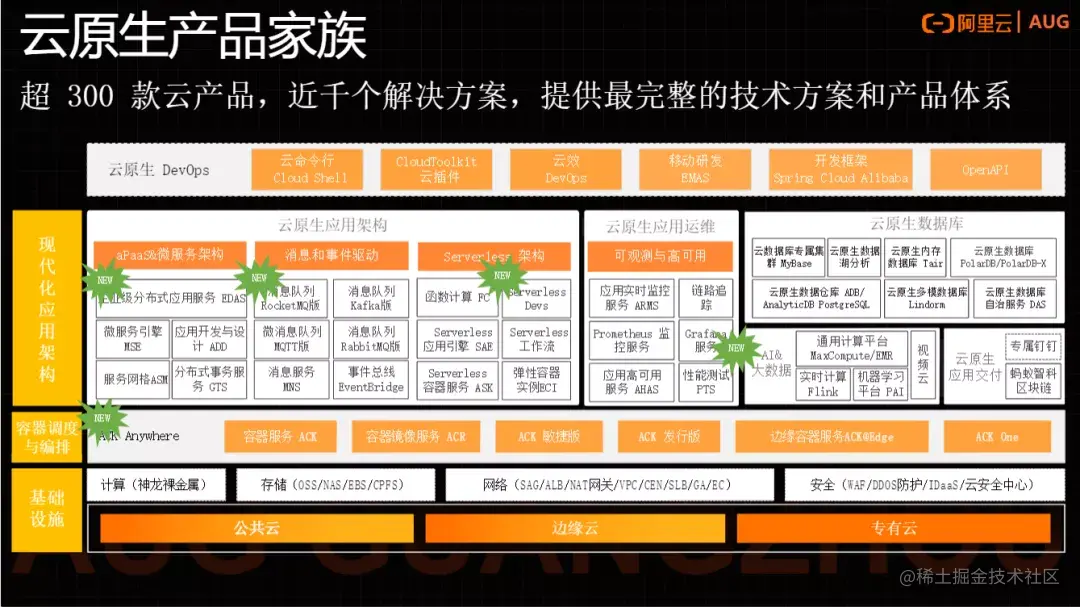 在上图可以看到,左边有一系列云原生技术,和云计算相结合的时候,它会产生一系列云原生的产品,包括我们之前讲到的容器服务,K8s 作为 CNCF 的第一个项目,一定是我们今天云原生整个体系的核心。还包括围绕云原生的中间件、数据库、安全,今天都按照云原生的模式去运行,里面用到云原生的技术,帮助用户去构建符合云原生定义的应用和系统。