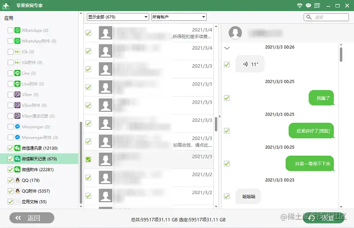 步骤二: 扫描结束后,会显示以下画面,在左侧的应用栏下拉找到“微信聊天记录”,将显示出来的聊天记录进行选择并恢复即可。