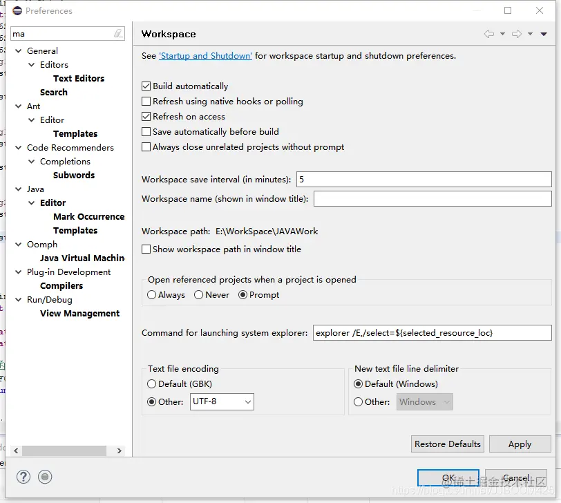 接下来我打开eclipse,因为学校发的新电脑,重新下了jdk与eclipse,所以打开发现在preferences中没有找到maven: