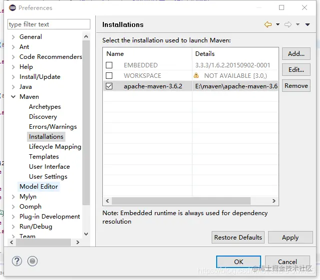 finish后可以在这里看到多出了一项,我们勾选这个apache-maven-3.6.2,点击Apply即可