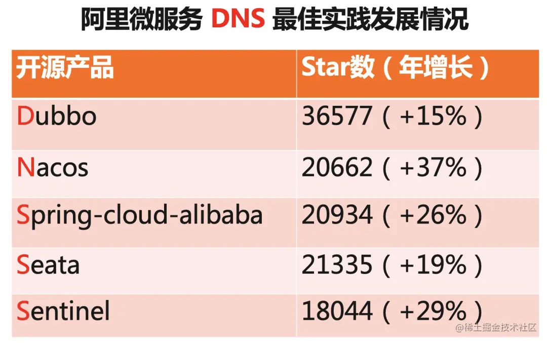 - 阿里微服务领域开源产品的关注度提升 20%左右,Star 数在过去一年陆续突破 2 万,关注度持续提升。