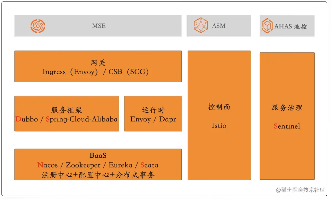 **产品矩阵:**MSE=微服务(数据面) / ASM=服务网格(控制面) / AHAS 流控=服务治理(治理面)。