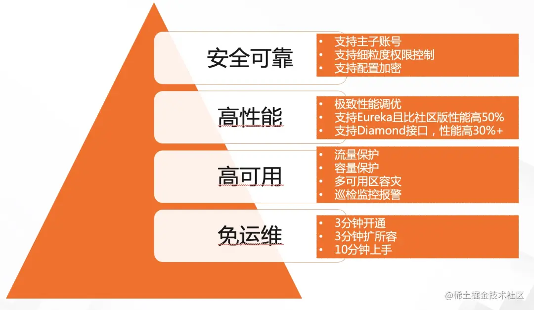 - **高可用:**提供多可用区容灾,默认监控报警策略,推空保护,支持限流降级,支持流量灰度。