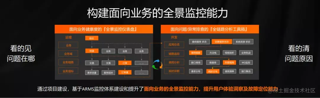 如果没有出问题,我们也要知道中台服务的调用量,这些都要看得很清楚,出现问题也要快速定位、快速修复,这对于我们业务中台非常重要。基于项目建设中的 ARMS 监测体系,可以提升用户体验洞察和故障定位能力,这一点是不可缺失的。