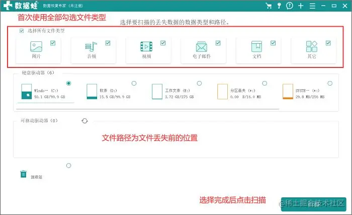 第1步:进入软件(www.shujuwa.net/shujuhuifu/ )后选择删除的文件类型,还有文件删除之前的存储位置,选择完成后即可“扫描”;