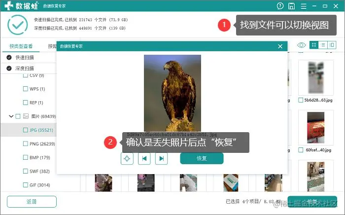 第2步:在扫描结果中找到自己删除的那个文件后,图以照片为例,可以先预览一下自己丢失的照片,随后确认自己后点击“恢复”即可!