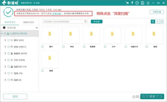 注:但第一次扫描结束后,如果在扫描结果中找不到自己删除的文件,只需要点“深度扫描”即可!