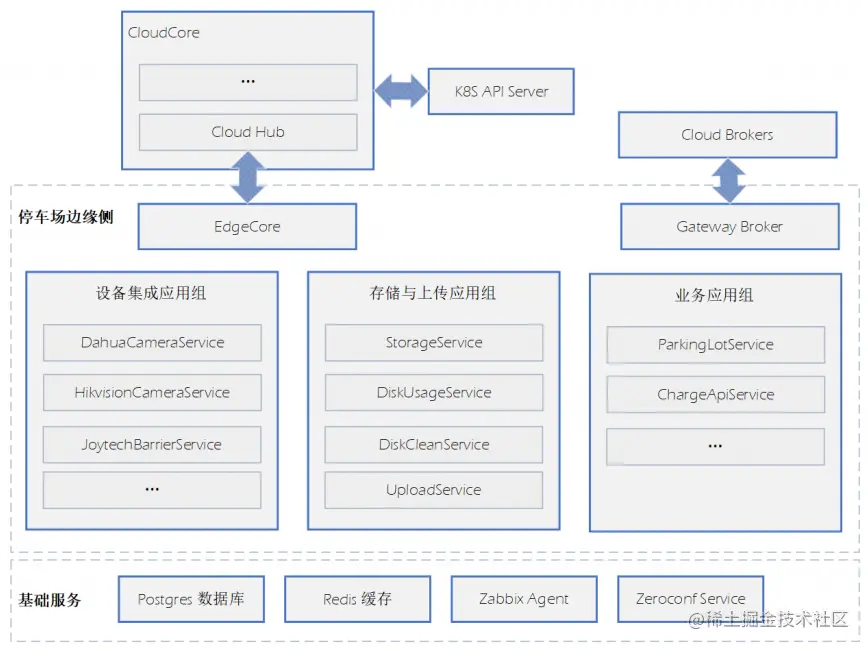 其中,停车场边缘侧被设计为一组低耦合的容器化应用,充分利用 Kubernetes 和 KubeEdge 的特性,以满足停车场的功能需求。