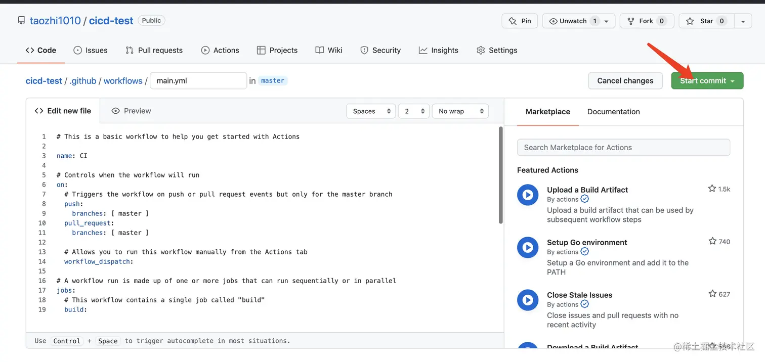 这里可以选择在线编辑,不过俺觉得网页编辑器不好用所以 点击start commit,自动插入一条commit 记录。 你的工作流文件在仓库中就创建好了,本地仓库执行 git pull 拉取代码 回到我们熟悉的vscode!!!