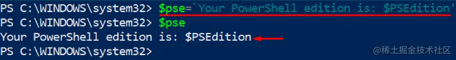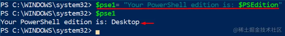 此外,单引号和双引号的区别在下面的例子中给出。例如,我们在字符串中写到 "你的**PowerShell版本是:PSEdition包含你的PowerShell版本的值。