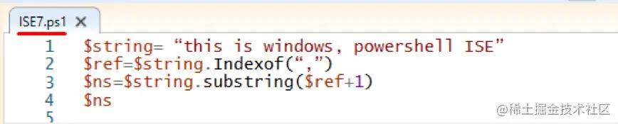第3步:为了找到字符", "之后的子串**,**你只需要传递一个参数,这个参数将在索引号上添加 "1",如下所示;输出结果将显示字符串中", "之后的剩余字符:代码如下,我们将代码保存在一个新的脚本 "ISE7.ps1"