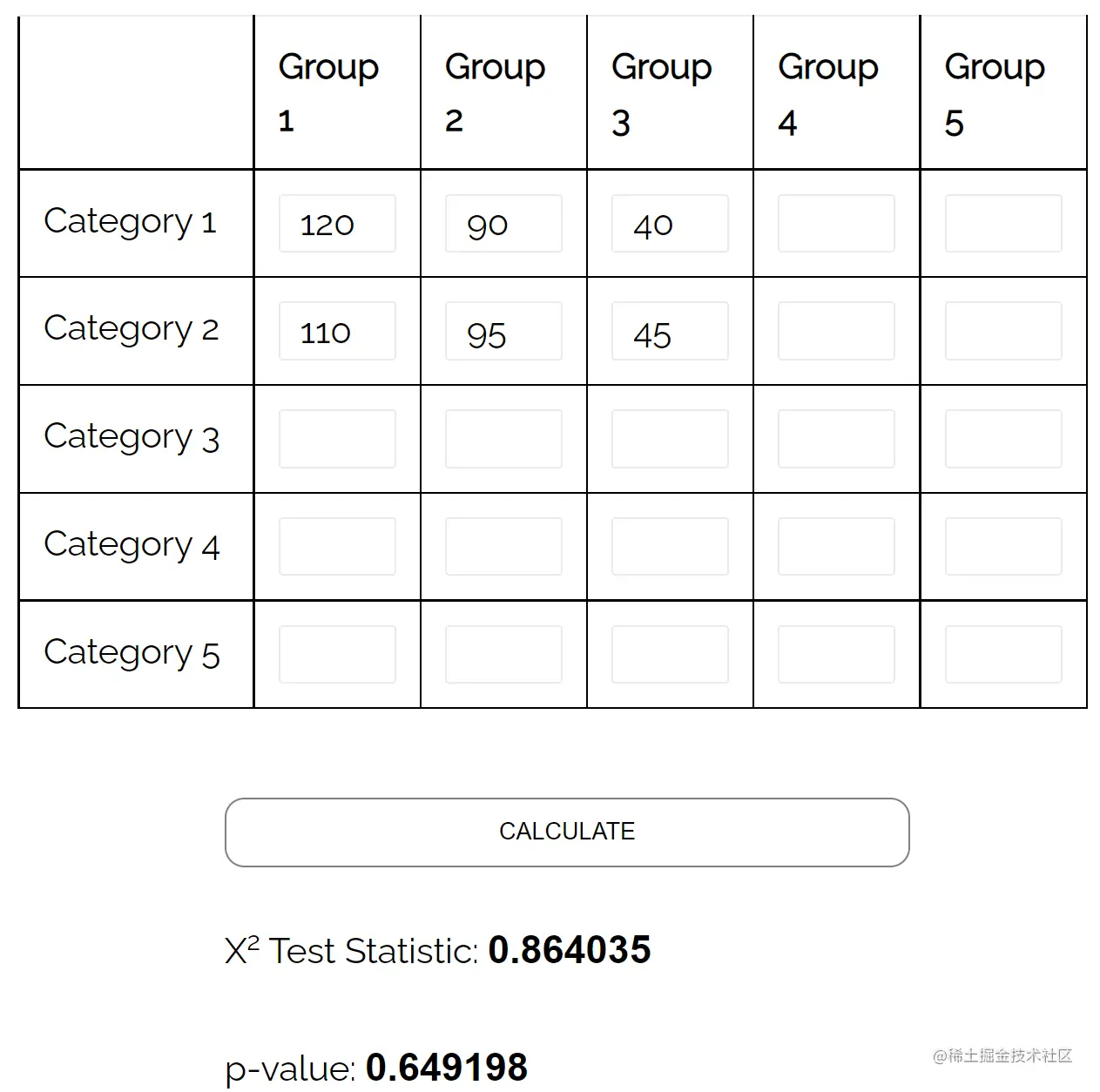 一旦我们验证了四个假设得到满足,我们就可以用这个计算器来进行独立度的Chi-Square检验。
