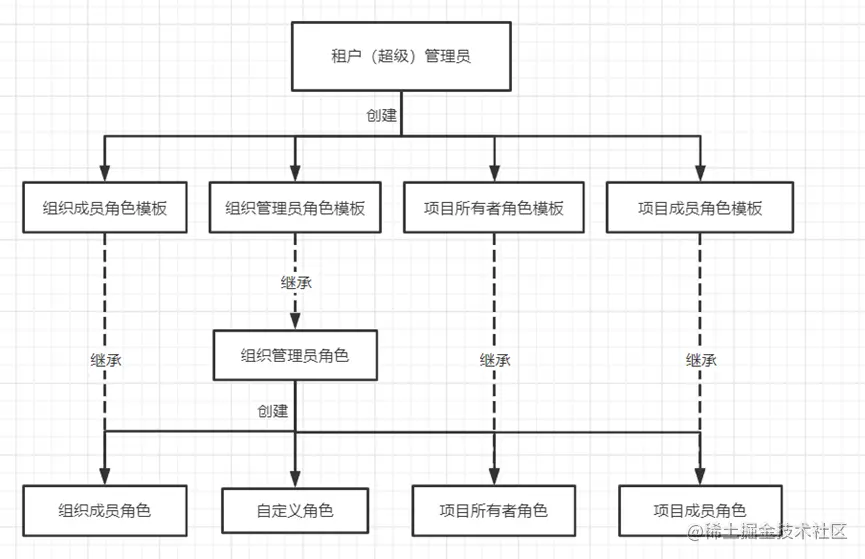 **HZERO角色体系分创建体系和继承体系,创建体系表现在父、子角色关系****上,继承体系表现在继承角色关系上。**两种体系的区别是:在分配权限时,例如,在给租户模板角色分配权限后,所有继承自该租户模板角色的角色将自动拥有该租户模板角色被分配的权限,用户可以一键往下分配继承自该租户角色模板的角色权限;创建体系则不能一键往下分配子角色的权限。在回收权限时,会回收整个创建体系、继承体系的权限。