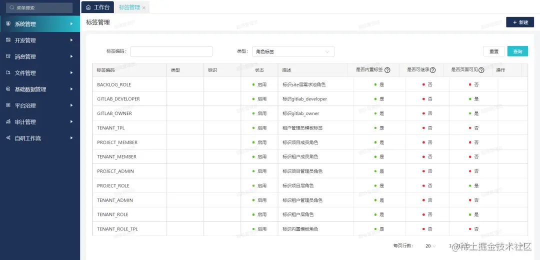 使用平台管理员角色,进入平台管理-》HZERO菜单-》角色管理菜单,进入HZERO标签管理界面。选择角色标签,可以查看猪齿鱼的所有角色标签及其含义。