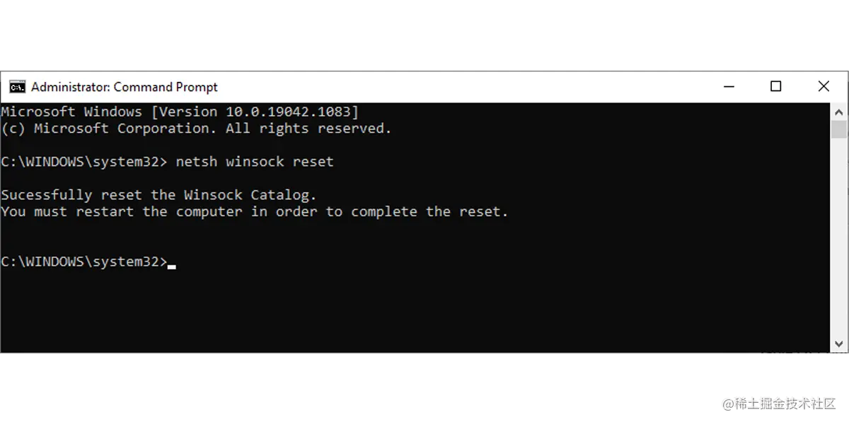 - 在命令提示符窗口中,输入netsh winsock reset。然后,按回车键。