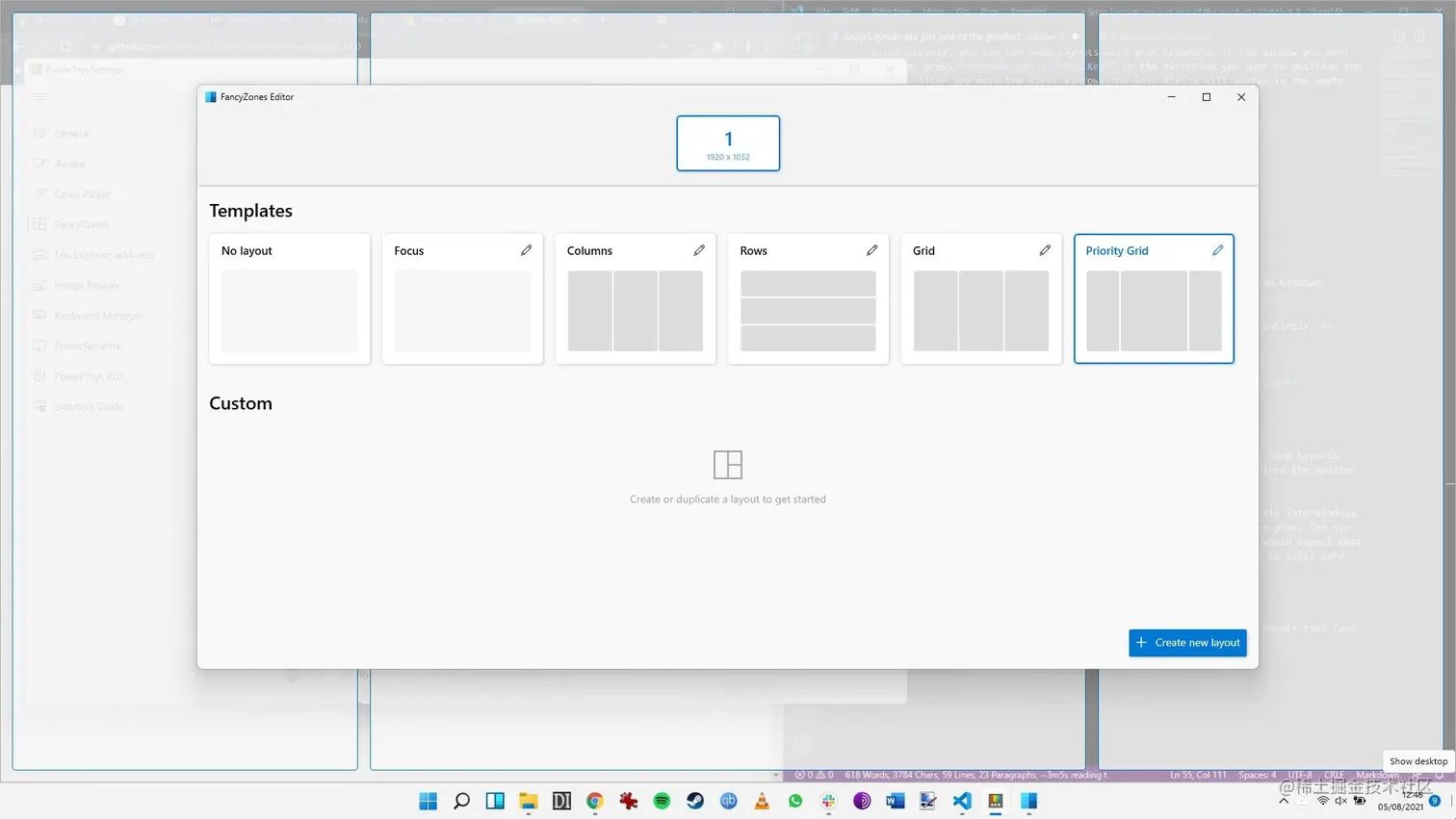 在继续之前,我们先来看看如何使用PowerToys FancyZones创建一个自定义的Snap Layout。