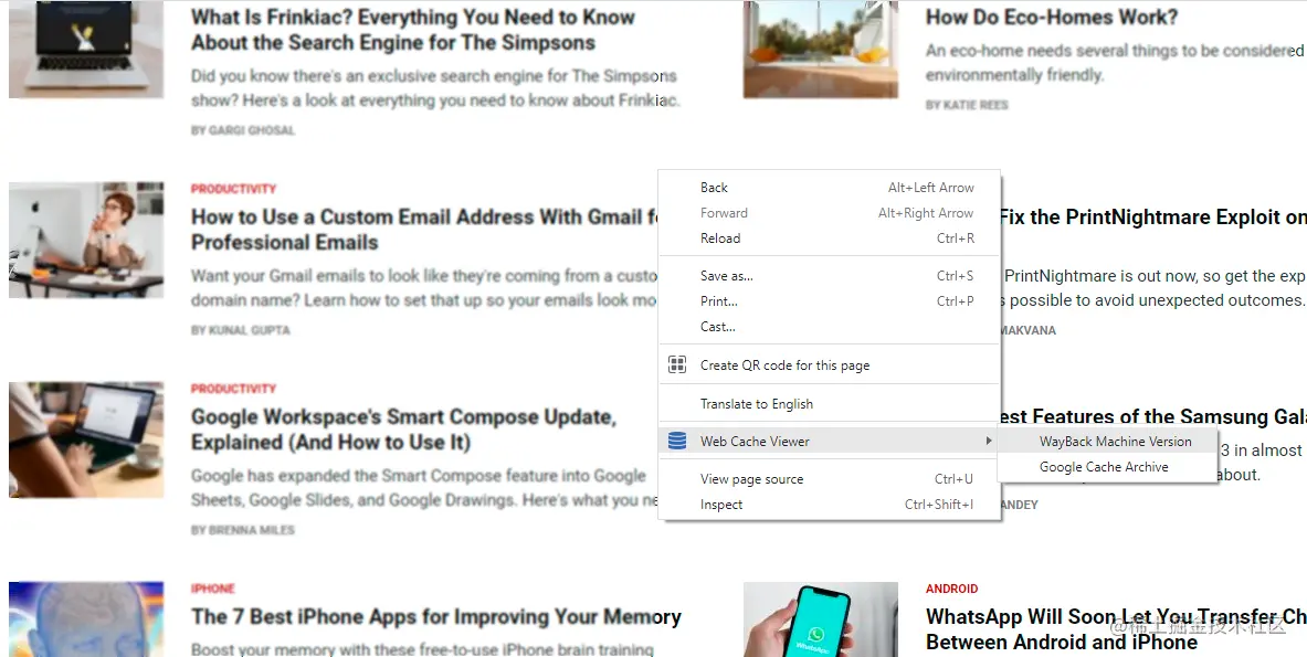 这个扩展使查看旧网站版本变得更加简单。只要进入你想看的旧版本的网站,在屏幕上点击右键,然后选择Web Cache Viewer。该扩展会打开一个新窗口,显示最后的缓存页面。