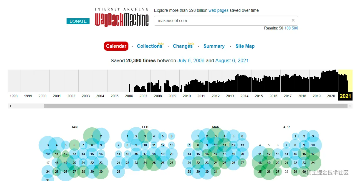 要找到任何网站的旧版本,在Wayback Machine的搜索栏中输入URL。然后,该工具会显示一个逐年的时间线,用黑线表示快照的时间。在时间轴下方,有一个日历,显示截图的确切日期和时间。要查看快照,将光标悬停在圈出的日期上并选择时间。