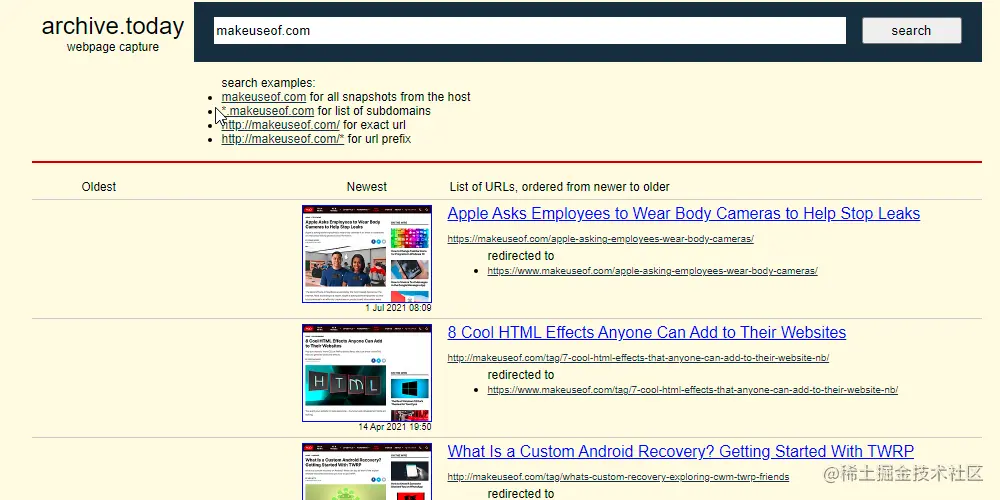 要查看任何网站的旧版本,你可以搜索它的URL。archive.today然后按时间顺序倒过来显示该网站的所有快照。该工具还建议了一些搜索操作符来完善你的结果。最重要的是,有一个选项可以将网页下载为ZIP文件并分享该网页。