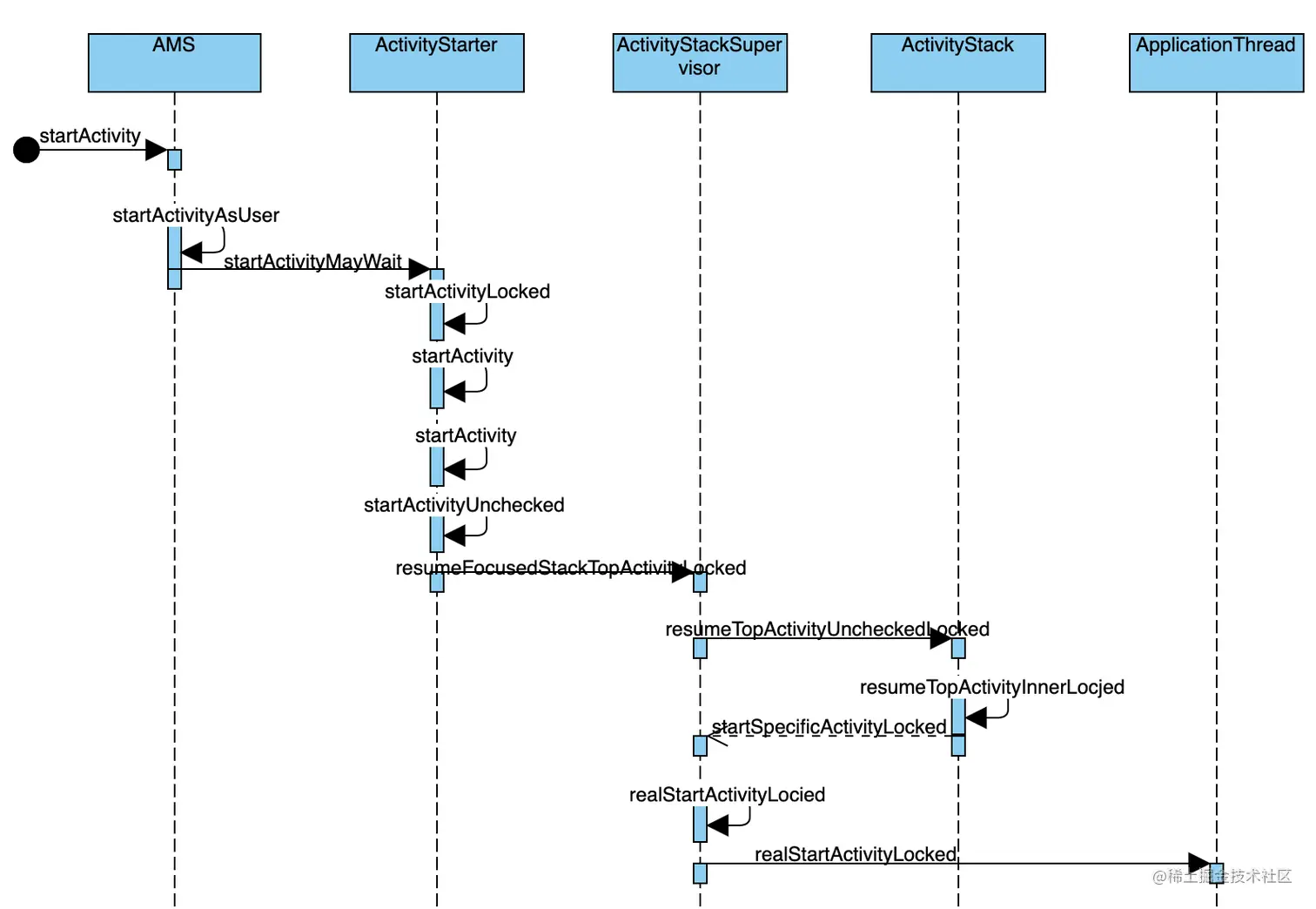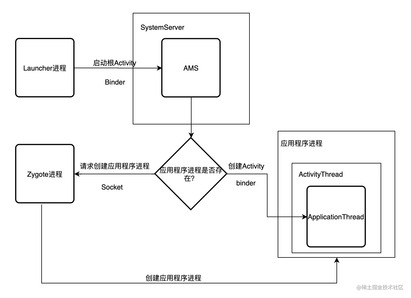 这里介绍Activity的启动过程其实省略了一步,就是App第一次是如何启动Activity的。上面写的调用方法其实已经启动了一个Activity了。我们知道启动一个应用其实是从Launcher进程中启动了应用的根Activity,也就是入口的Activity。而启动根Activity也是由AMS来完成的,其步骤跟2、3部分完全一样。但是第一次启动应用还有不一样的地方就是需要创建应用程序进程,而创建应用程序进程又是由Zygote进程来完成的。