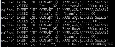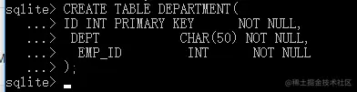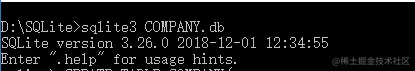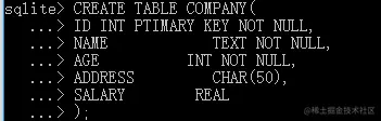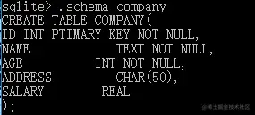3、创建数据库COMPANY表。没有报错说明已经成功。下一行直接是:sqlite> ;表示成功创建