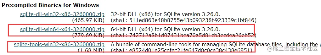 1.访问:SQLite Download Page,从Windows 区下载预编译的二进制文件sqlite-tools-win64- .zip 和 sqlite-dll-win64-.zip 压缩文件。