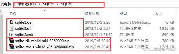 2.创建文件夹 D:\SQLite\SQLite,并在此文件夹下解压上面两个压缩文件,将得到 sqlite3.def、sqlite3.dll 和 sqlite3.exe 文件。