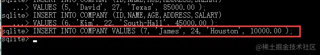 INSERT INTO COMPANY VALUES (7, 'James', 24, 'Houston', 10000.00 );