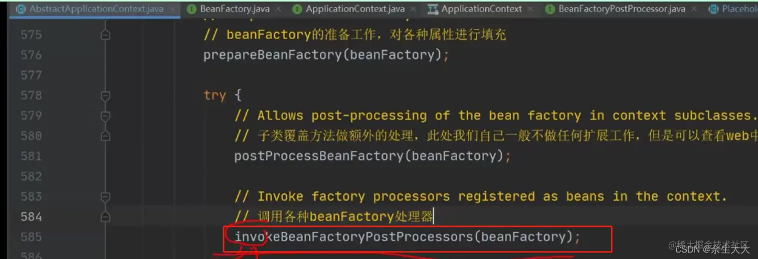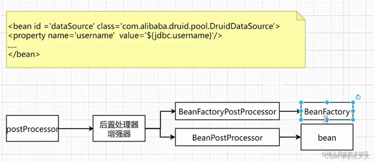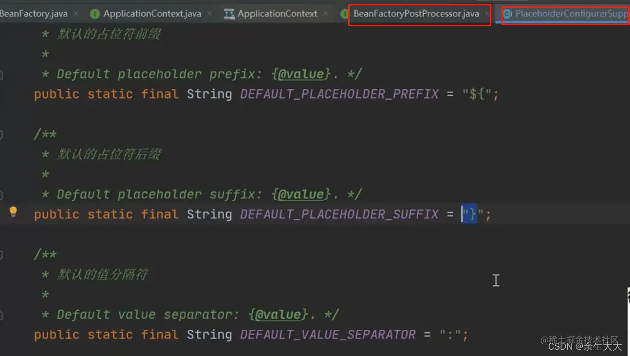 postProcesson就是各项扩展点,像上面处理占位符修改bean内容定义的就可以通过下面的BeanFactoryPostProcesson接口的PlaceholderConfigureSupport实现类进行占位符解析替换