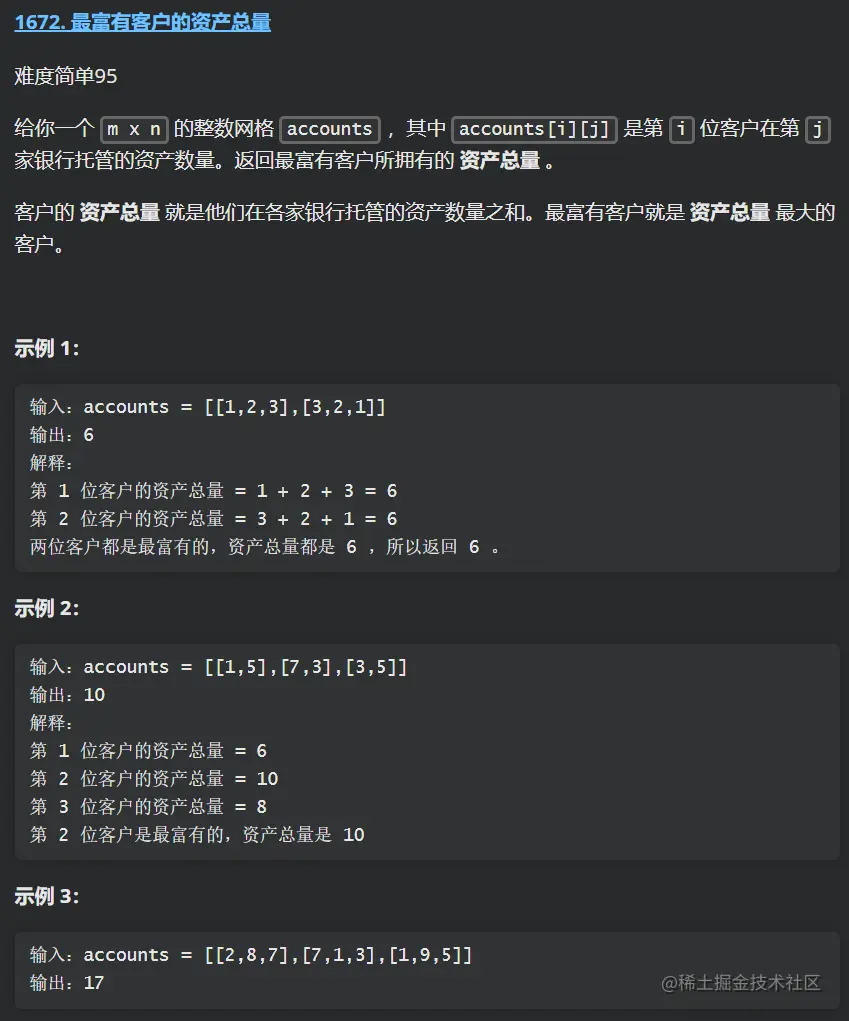 本次刷题日记的第 32 篇,力扣题为:1672. 最富有客户的资产总量素 ,简单
