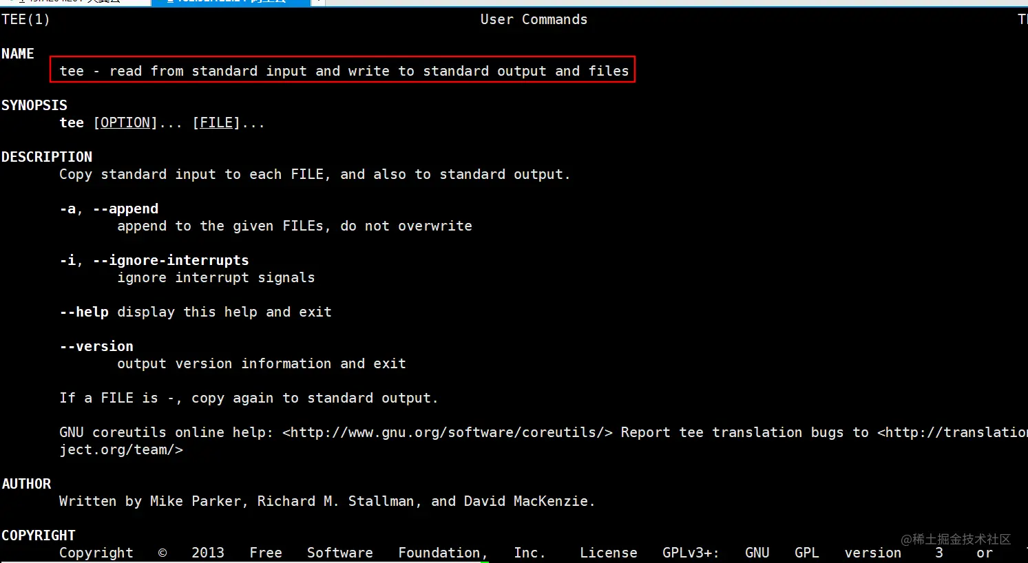 tee命令主要被用来向standout(标准输出流,通常是命令执行窗口)输出的同时也将内容输出到文件,下面是tee的man 信息