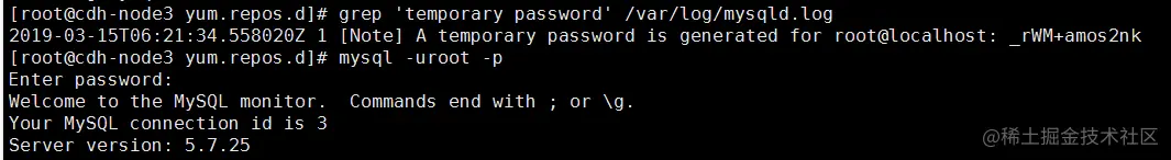 为了加强安全性,MySQL5.7为root用户随机生成了一个密码,在error log中,关于error log的位置,如果安装的是RPM包,则默认是/var/log/mysqld.log。一般可通过log_error设置。