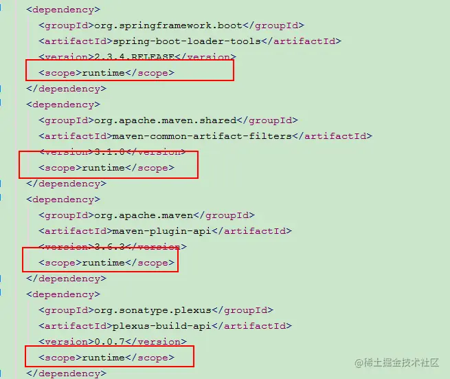 原因如下:SpringCloud里有很多scope属性为runtime,如下